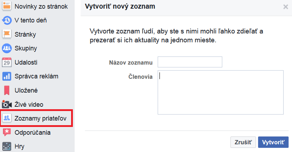 Teraz stačí len pár klikov, aby ste všetko mali pod jednou strechou. Ako prvé, musíte kliknúť na ikonku „zoznamy priateľov", ktorú nájdete v ľavej časti obrazovky. Následne si dáte „vytvoriť zoznam", kde si postupne môžete pridať všetkých priateľov alebo len tých, ktorých príspevky vás zaujímajú (minimálne musia byť dvaja). Následne už len stlačíte „vytvoriť".