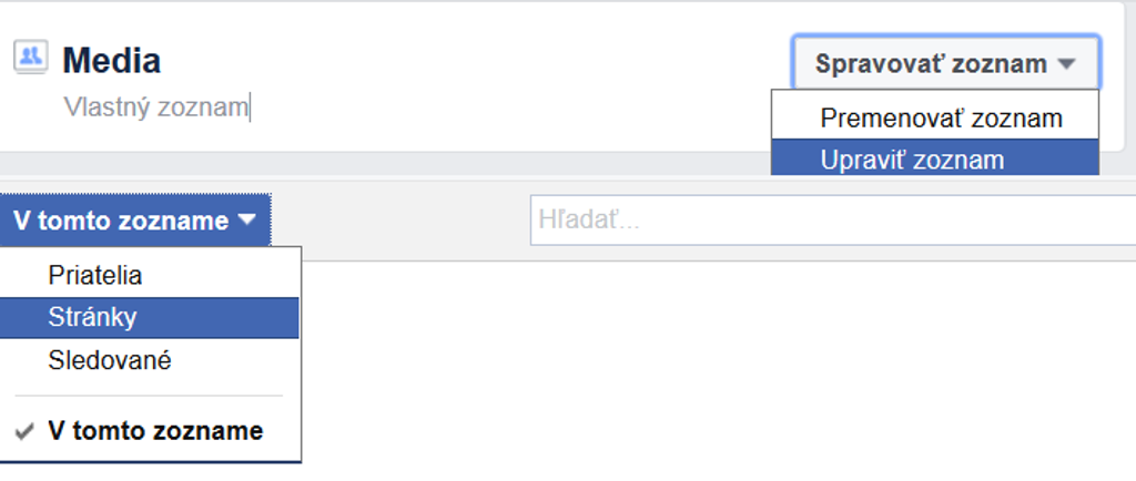 Teraz už len v pravo hore kliknete na „spravovať" a „upraviť" zoznam a v „tomto zozname" kliknete na „stránky", kde sa vám ukážu všetky vaše stránky, ktoré sledujete. Následne si ich už len vyberiete a kliknete na „dokončiť".