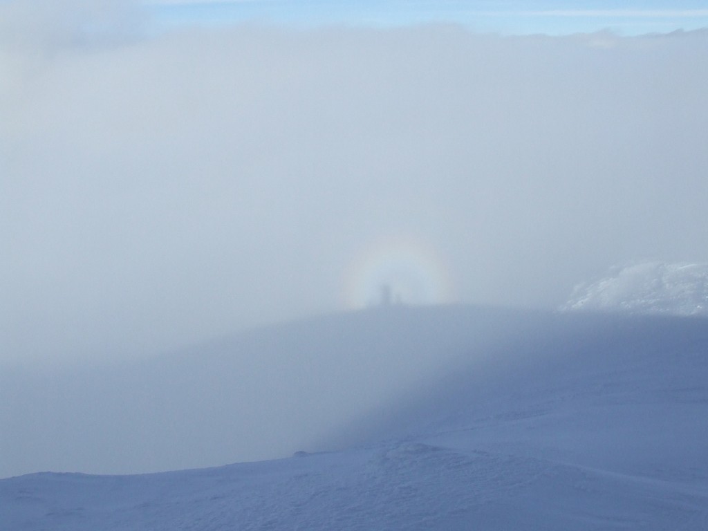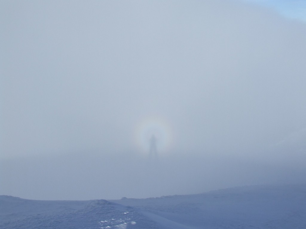 Pred vami je hmla a za vami slnko. Premietnutím vášho tieňa na hmlu vzniká ohybový jav, akási aureola.