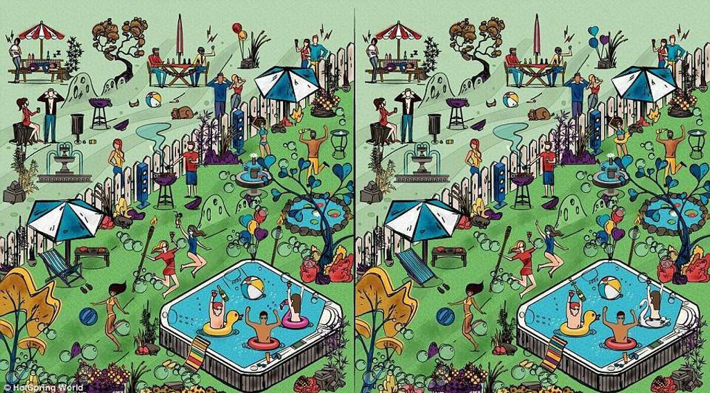 Za úlohu máte nájsť na obrázku, ktorý sa skladá z dvoch výjavov zo záhradnej párty, osem rozdielov.