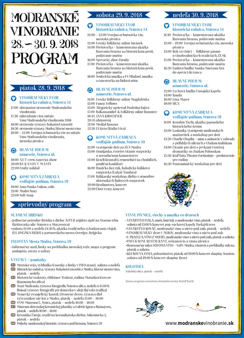 Posledný septembrový víkend sa Modra premení na živé centrum tradičných osláv úrody, malokarpatského vinohradníctva a vinárstva. Modranské vinobranie sa začne v piatok 28. septembra a potrvá do nedele 30. septembra.