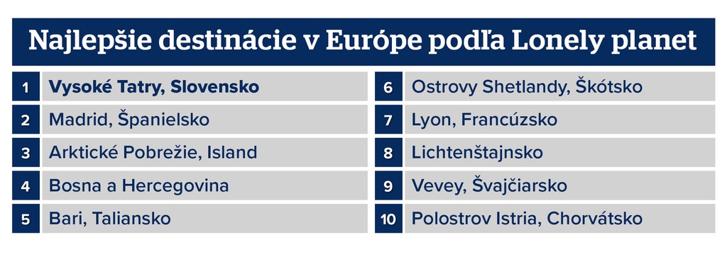 Cestovateľský sprievodca Lonely Planet vyhlásil Vysoké Tatry za najvýznamnejšiu letnú európsku destináciu. V rebríčku miest Tatry predbehli aj známe cestovateľské ciele. Na Lomnickom štíte o tom v utorok na tlačovej konferencii informoval Joe Reville, generálny manažér Lonely Planet pre strednú Európu, ktorý zároveň zástupcom regiónu symbolicky odovzdal toto ocenenie.